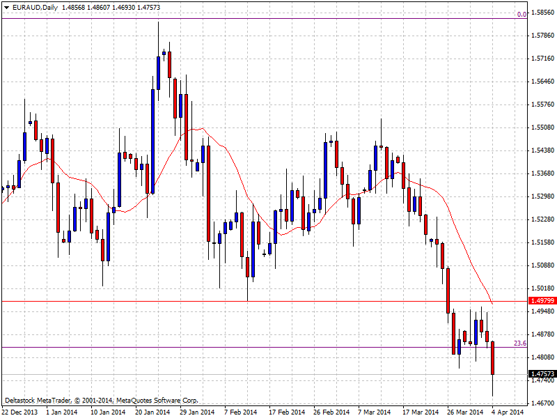 Nous sommes sur une tendance baissière depuis le 12-03-2014, nous sommes passés de 1.5530 à 1.4938 soit 592 pips de baisse.
