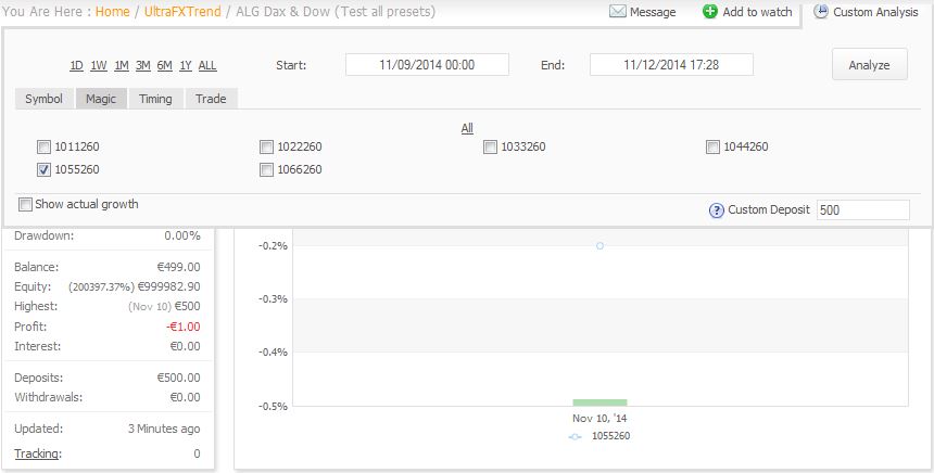 J'ai créé un compte démo Jfd où j'ai placé plusieurs paramètres différents sur le Dax et le dow jones. Pour ceux qui veulent suivre avec moi les performances de chaque paramètre, il suffit de sélectionner un magic number et de cliquer sur "Analyse".