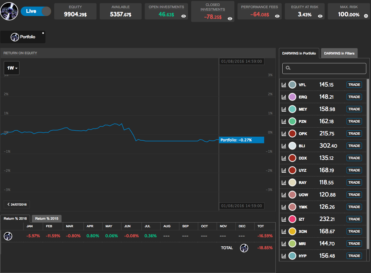 Je me suis absolument gardé d'investir sur des Darwins type HBZ qui pour moi sont des mirages voués à se dérégler à un moment ou un autre et partir en vrille, car vraisemblablement suroptimisés et mécaniques, non humains, durs à s'adapter à des changements de marché. J'ai donc choisi des Darwin aux allures de trading discrétionnaire, qui avancent avec plus ou moins de difficultés et de pics et vallées.