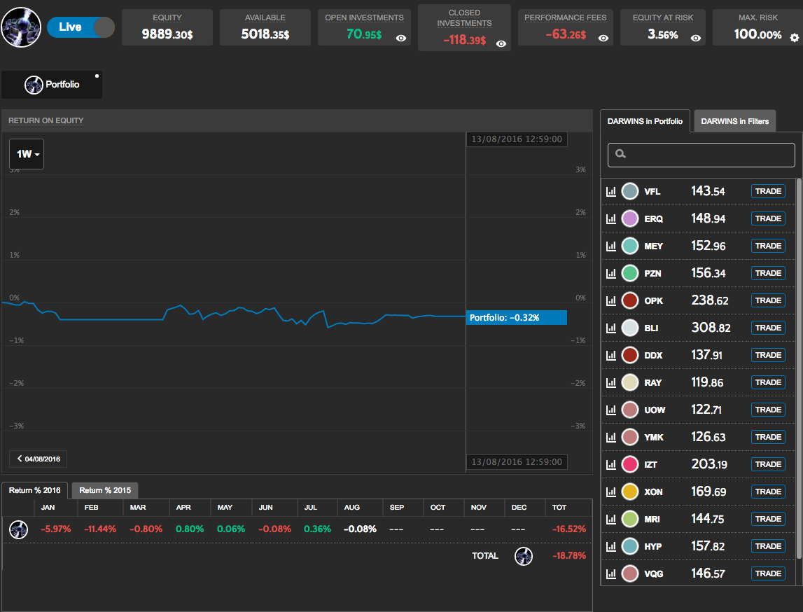 Je me suis absolument gardé d'investir sur des Darwins type HBZ qui pour moi sont des mirages voués à se dérégler à un moment ou un autre et partir en vrille, car vraisemblablement suroptimisés et mécaniques, non humains, durs à s'adapter à des changements de marché. J'ai donc choisi des Darwin aux allures de trading discrétionnaire, qui avancent avec plus ou moins de difficultés et de pics et vallées.