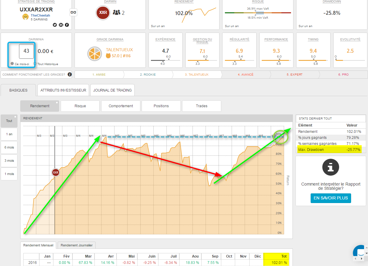 Nota: Message croisé: Non aucun pétage de plomb de l'EA NI de changement de règles. Tu parles trop sans analyser la strat et les données offertes par Darwinex en transparence. Y a peut-être trop d'onglets pour toi ? Je ne vois pas où j'aurai perdu le contrôle puisque c'est l'EA qui gère, moi je constate c'est tout. J'ai toujours dit et annoncé les DD max journalier possible car j'ai des stop loss fixes c'est assez simple à comprendre je pense. Après tu prends 20/Var de la strat et tu multiplies ce risque et tu obtiens celui du darwin. Donc comment dire... :lol: