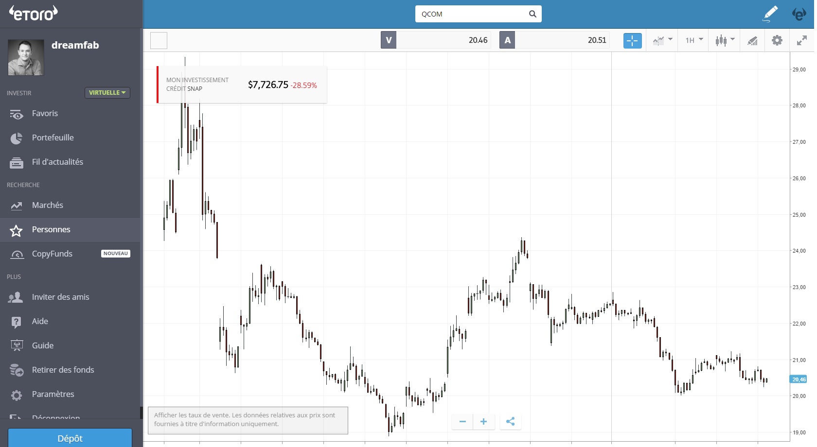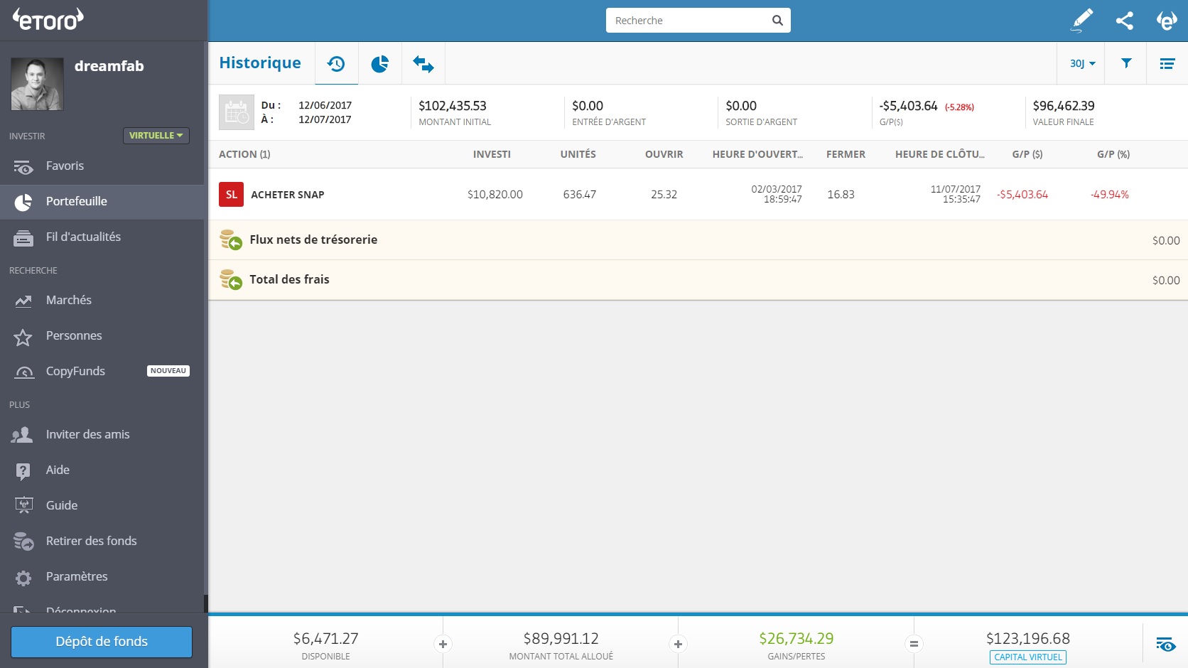 J'ai fermé mon achat de Snapchat (sur compte démo) réalisé lors de l'introduction en bourse du titre il y a quelques mois: