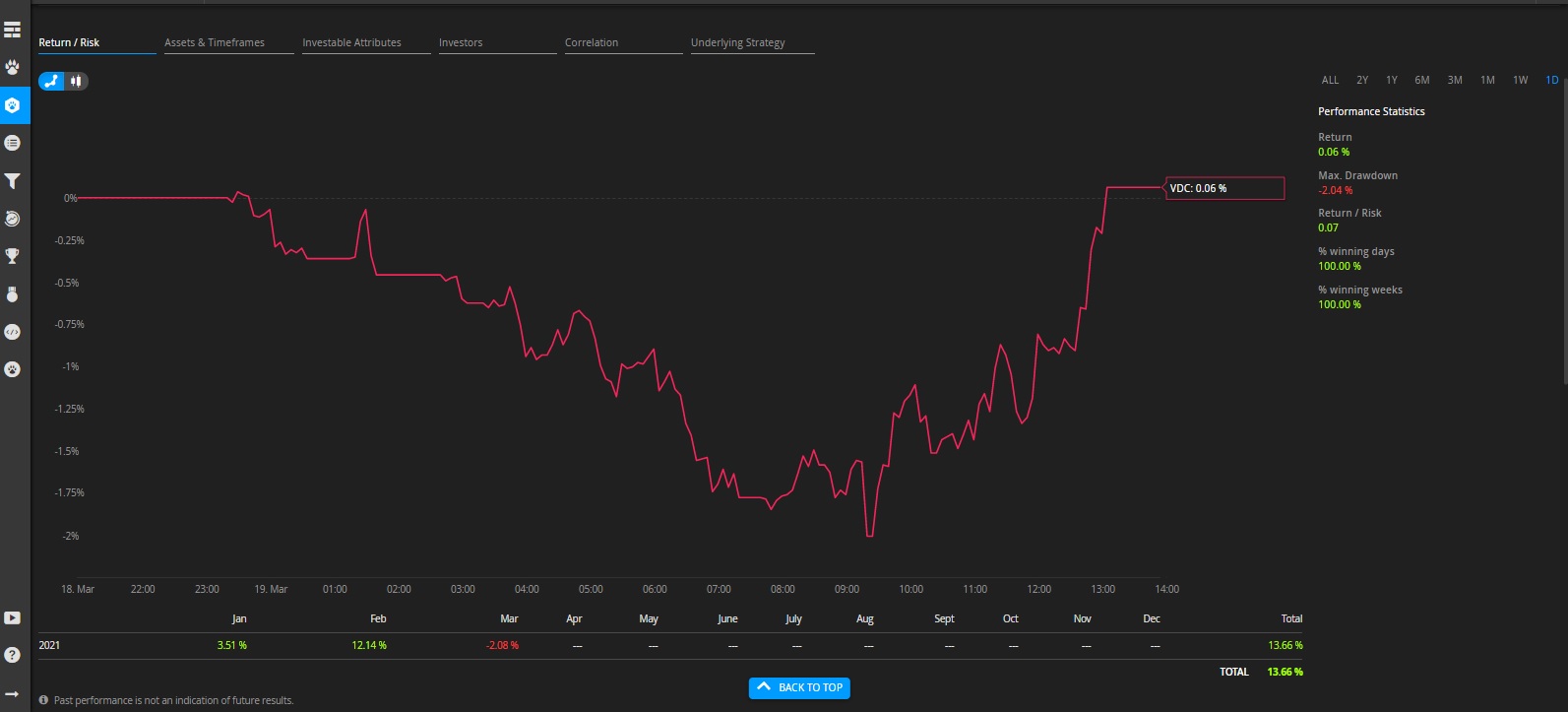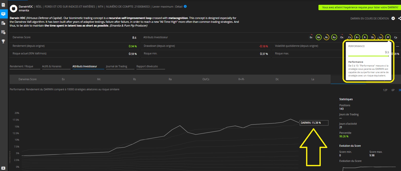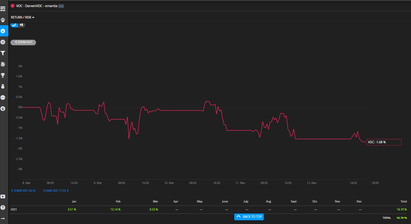 En cliquant sur l'attribut "Performance" sur la page du compte de trading qui pilotera le Darwin VDC, nous pouvons avoir une première estimation de la performance lors de sa sortie, lundi 1er mars : https://www.darwinex.com/fr/account/D.192173#