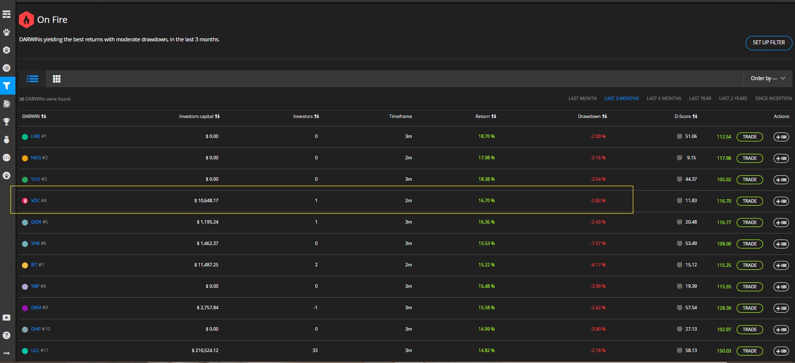 aujourd'hui Lundi 1er mars 2021, le Darwin VDC vient tout juste d'être listé sur le Darwin Exchange : https://www.darwinex.com/fr/darwin/VDC#