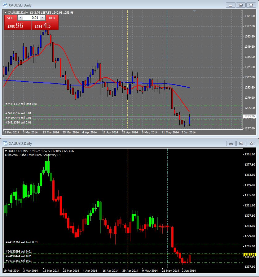 en ce qui concerne mes indicateurs l'Obo trend bar est bien passé en rouge foncé ce qui me donne une zone ou le prix est travaillé sans trop de tendance ma MM2OO reste bien baissière mais la MM10 elle tend a relever un peu la tête ,mais la aussi pas d inquiétude l hekein ashi smoothed lui commence a réduire sont angle mais attention il peu replonger avec force donc pour l instant et comme je dit depuis quelques jour patience.