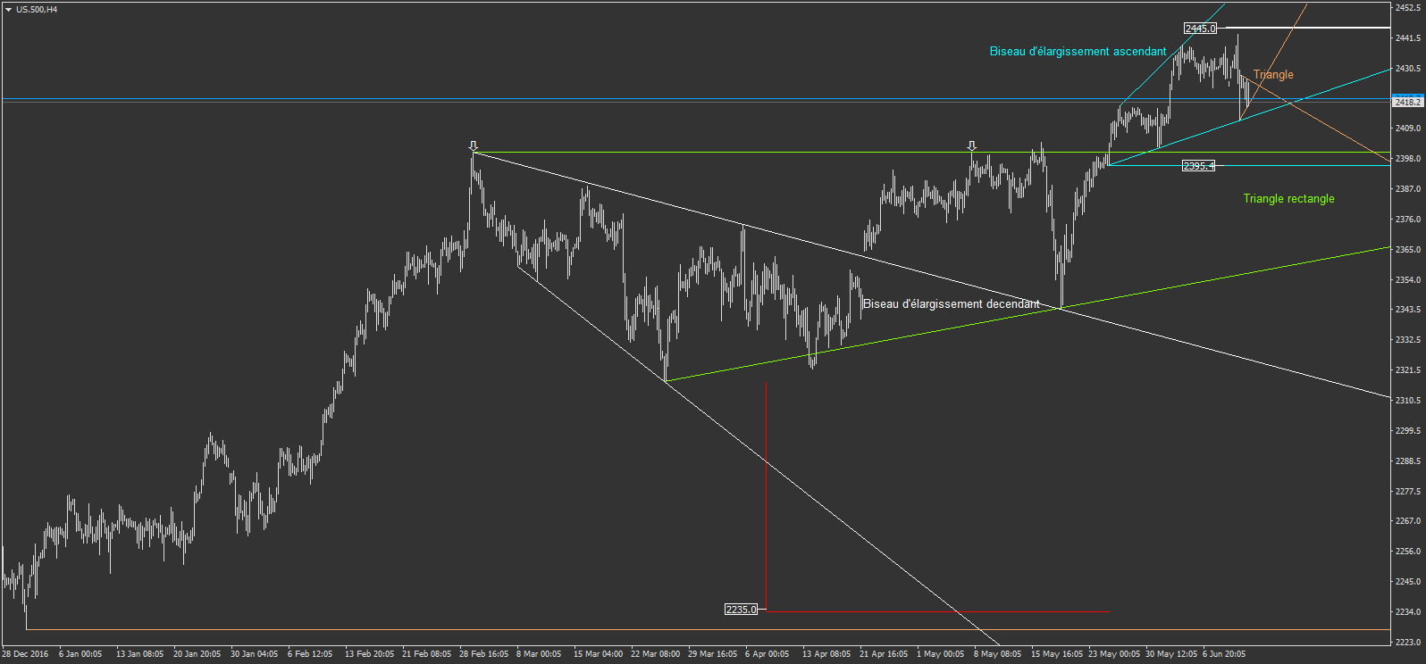Sur US.500 je me suis mis un ordre différé pour une baisse imaginé. on voit un gros triangle rectangle sur lequel j'imagine un pullback, retour sur ce triangle qui pourrait ce faire grâce à un biseau d'élargissement ascendant comme on le voit sur l'image. j'ai un stop de 45€ pour un petit objectif de 225€