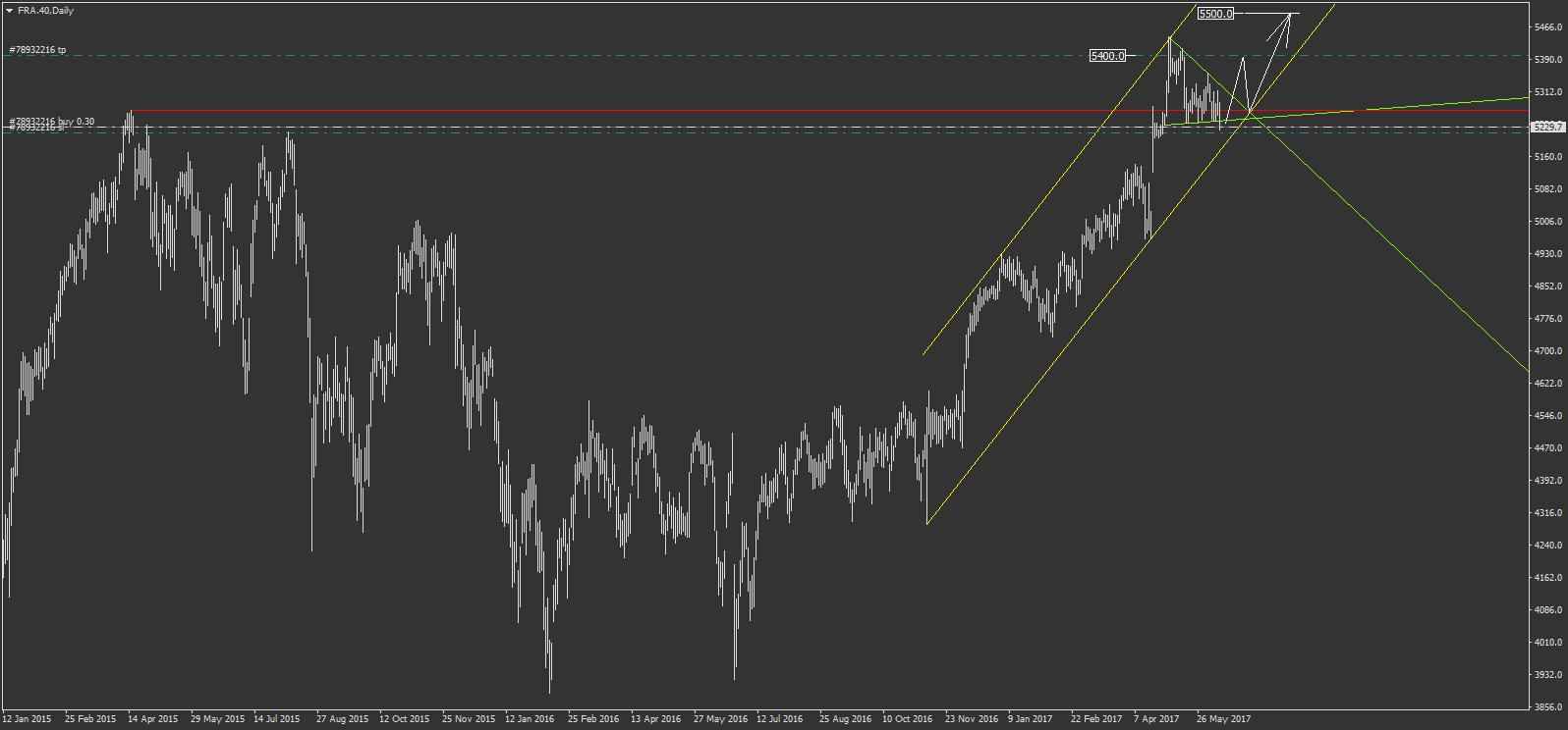 alors, sur le FRA.40 je suis assez confiant sur ce trade, mais comme l'on vient de le dire, ce ne sera pas la première fois où je suis confiant et ou il y a des risque que cela échoue lamentablement lol. on verra donc!