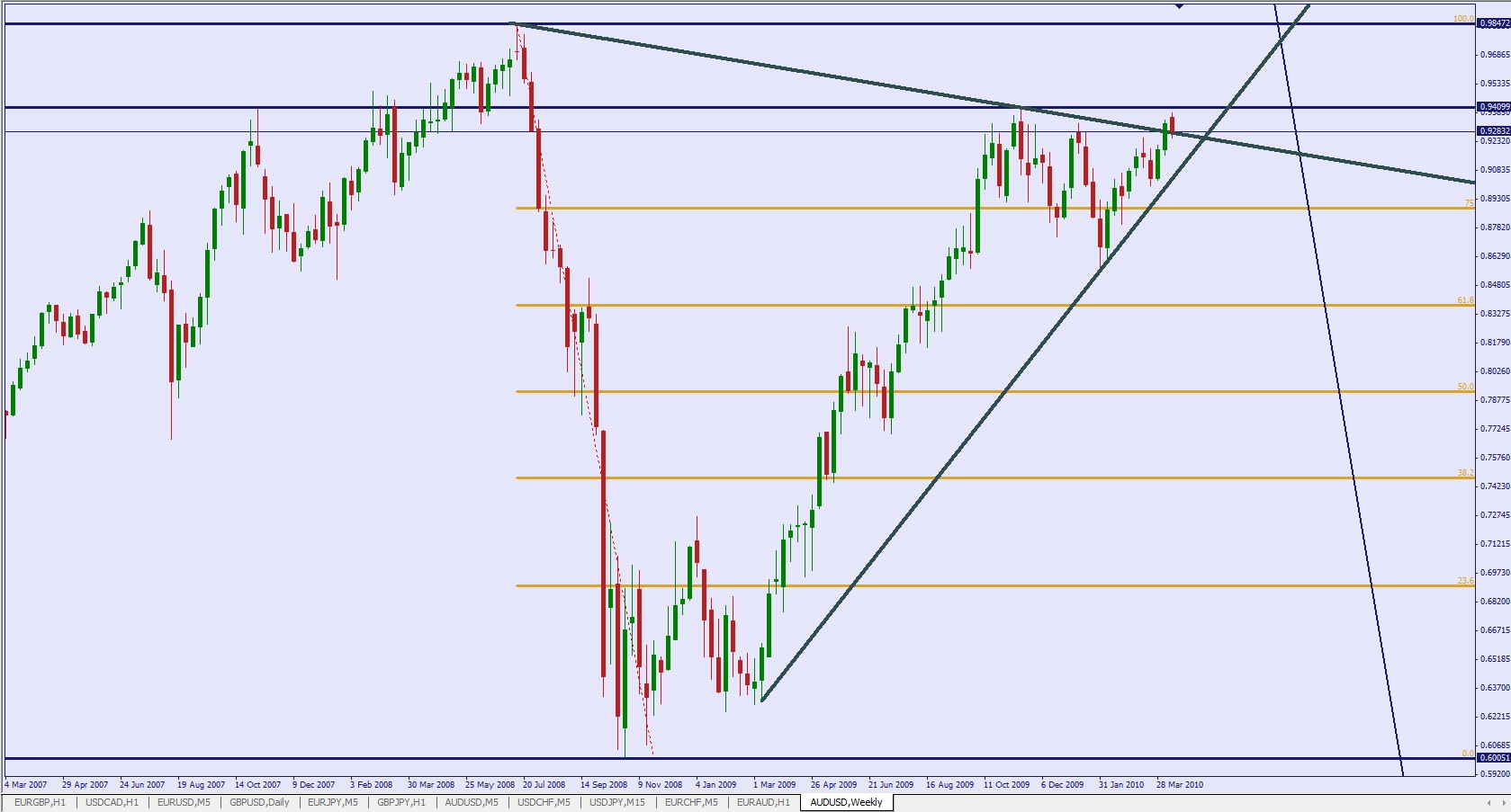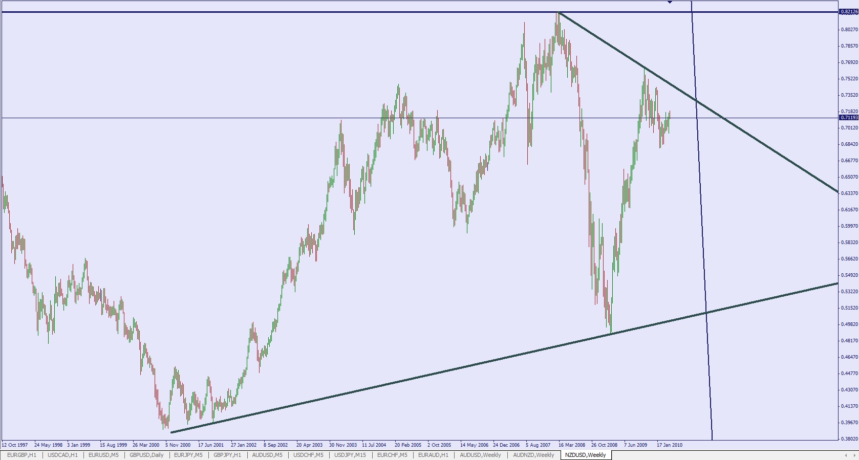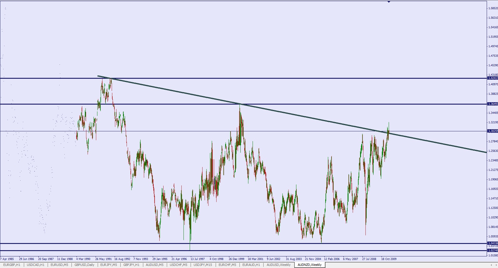 J'ai repose des ordres sur aud/nzd pour remplacer ceux encaisses et en ajouter eventuellement pour une reserve TLT. Commence a poser qques petits ordres shorts sur aud/usd et nzd/usd (petits car ca bouffe beaucoup d'interets et comme ca rentre juste dans la zone de shorts, on prendra plus gros plus haut si ca y va) la, se sont juste des ordres test qui ne peuvent pas trop heurter en cas de montee delirante. (voir le graphe hebdo)