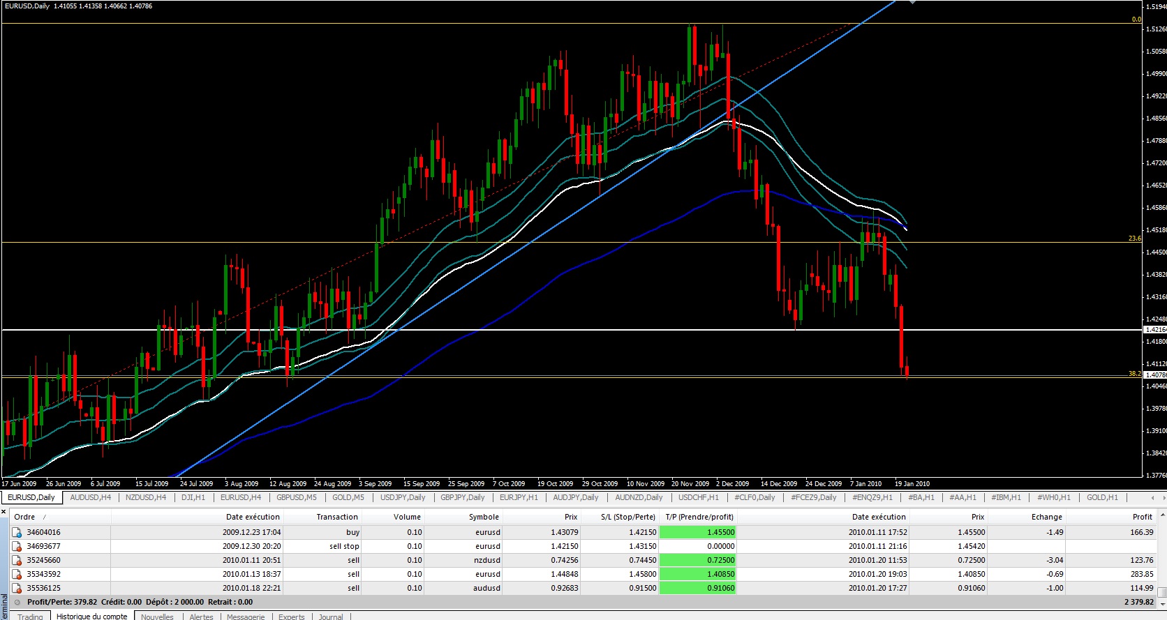 Pour NZD / USD comme Nouche s'est désister devant tant d'incohérence au niveau du money management du compte j'ai décidé de placer le Stop Loss au dessus du dernier plus haut (comme on le voit ci dessus en H4) et de placer le Take Profit à 0.7250 au niveau (juste au dessus) du retracement de 50% du mouvement baissier du 16/11/09 au 23/12/09.