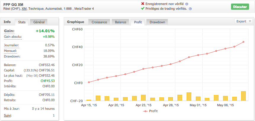 Malheureusement le 1er mai j'ai fait une bourde en mettant une version de l'EA avec une limitation du flottant qui m'a fermé une série de trades en perte.