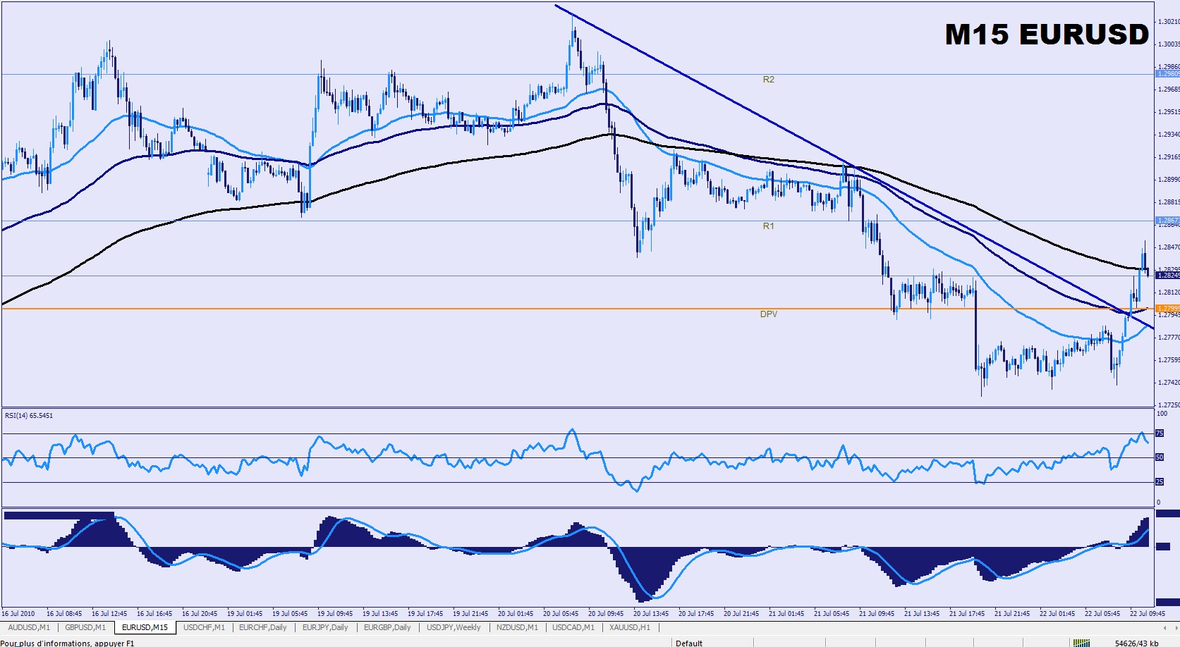 Sur EUR/USD en intraday pour ma part je tenterai bien un long pour jouer le pullback sur franchissement à la hausse de la trend line baissière qui conduisait la tendance depuis le 20, en cas de retest du point pivot du jour à 1.27995 ou juste au dessus.