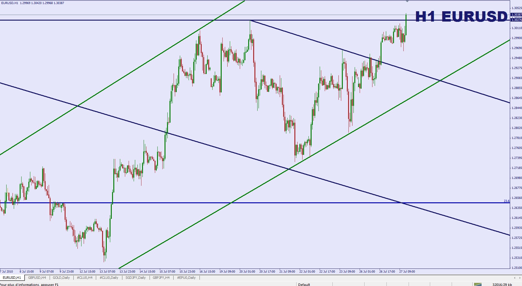 J'ai fixé mon objectif à 1.31 mais avec un peu de recul, je me rend compte que c'est juste au dessus de la résistance horizontale qui avait stoppée les assauts haussiers du 10/05/2010 matérialisée en bleu marine sur mon graph.