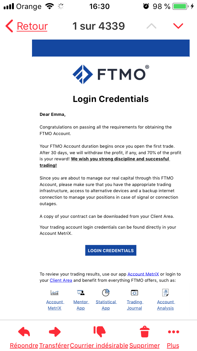 J'ai respecté les critères imposés ce qui m'a permis une fois mes frais remboursés et après avoir reçu mon premier virement de faire appel au professionnel qui a passé mon test au début pour faire un autre test à 50k$ et ainsi de suite.