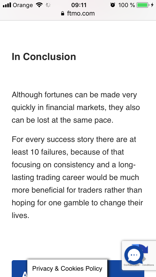 Pour finir, le seul petit conseil que je peux vous donner est de comprendre qu'il ne s'agit pas d'un moyen miracle de devenir riche, le défi FTMO n'est pas une blague et il est certainement difficile de réussir, alors faites attention. Si vous êtes un bon trader alors foncez si vous avez peur alors essayez de faire appel à un professionnel pour vous aider à passer vos épreuves.