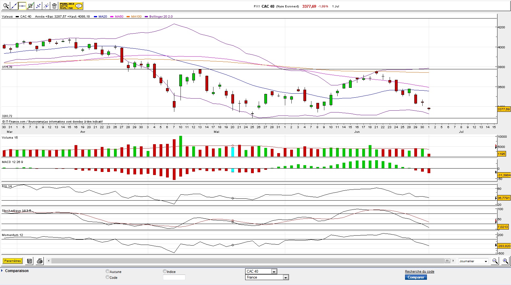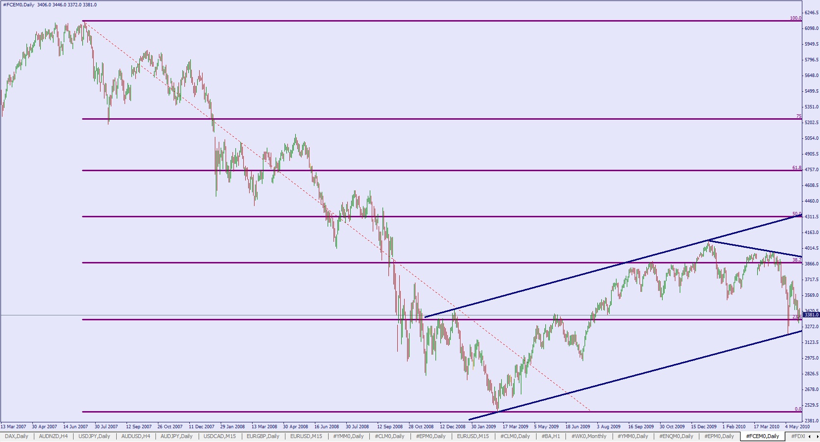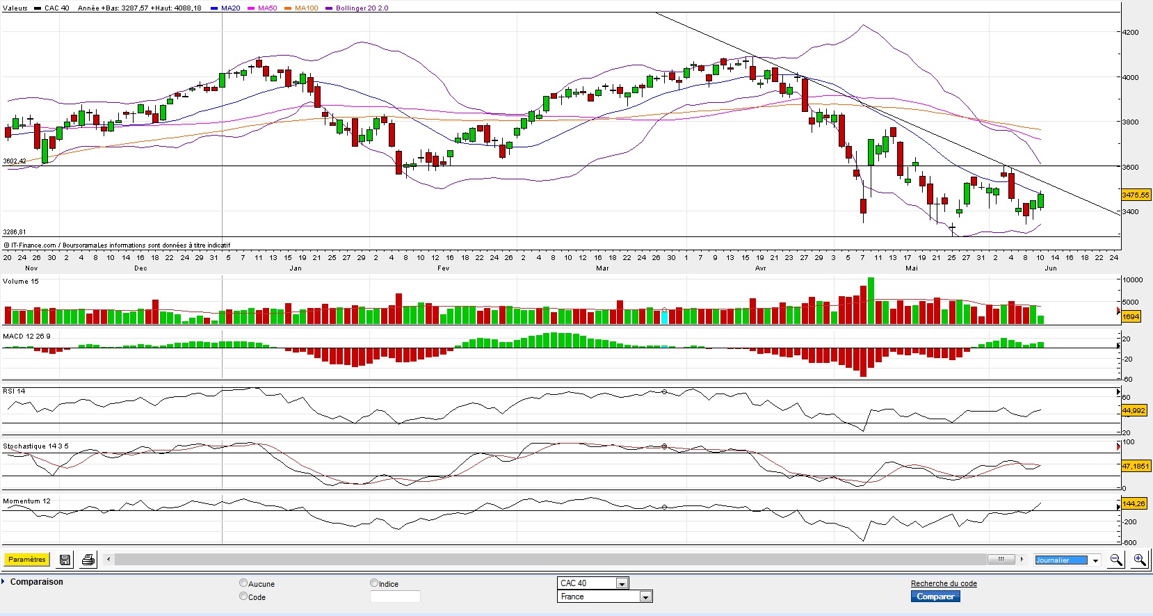 On marquerai alors un pic baissier qui nous permettrait de tracer une nouvelle trend line accompagnant le retracement de la crise et le prochain objectif haussier serait selon moi les 50% de retracement de la tendance baissière liée à la crise soit aux environs des 4300 points.