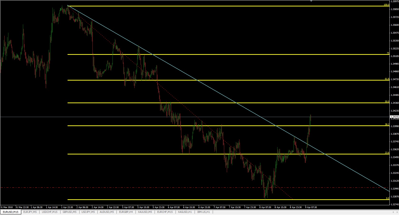 Donc à mon avis, suite à la hausse assez accentuée de ce mati, on va venir retester l'ancienne résistance oblique devenu support, créant ainsi une configuration de pullback intéressante. Si tel est le cas je prendrai position à l'achat sans hésiter pour viser au moins les 1.3434, soit juste en dessous du retracement de 50% du mouvement baissier court terme observé du 02 au 04 avril.