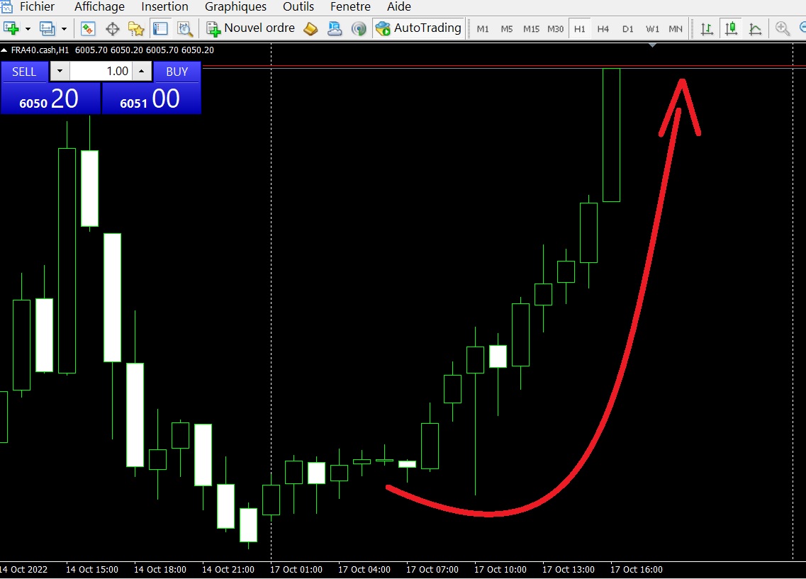 Oui ! Poussée foudroyante du CAC40 sur la bougie H1 de 15h00 :