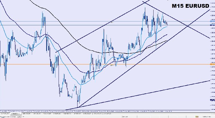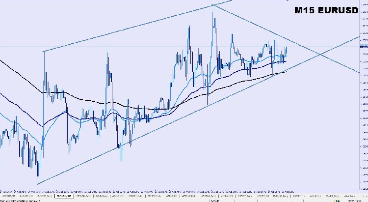 A court terme ici en M15, la tendance de fond étant haussière, en cas de sortie à la hausse du triangle tracé en bleu je prendrai certainement position à l'achat.