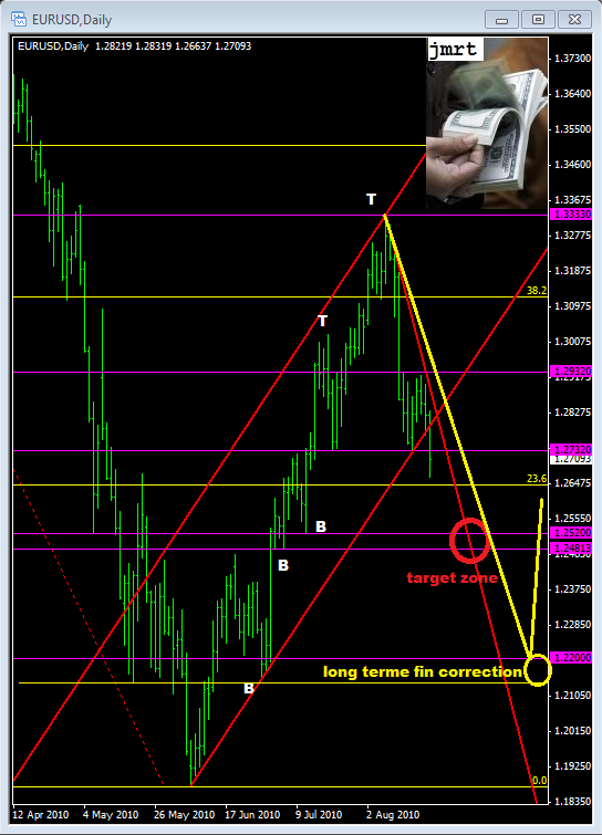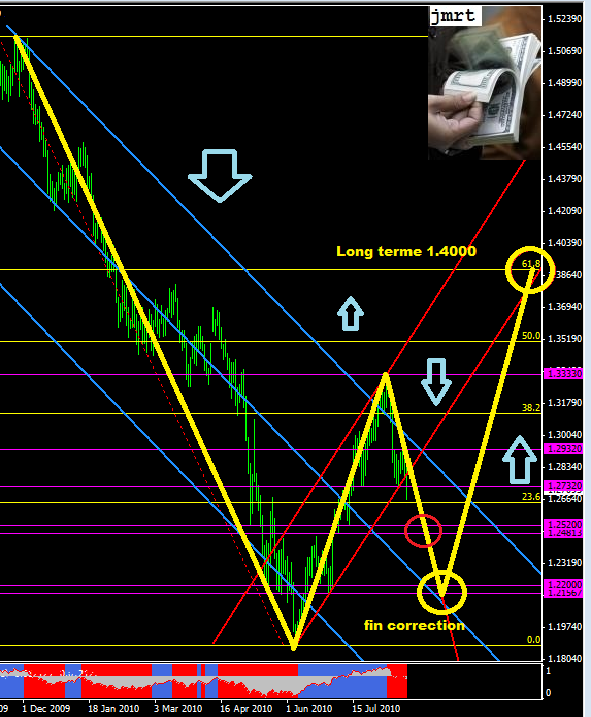 Pour le long terme, l’eurusd a formé un plus haut à 1.3333 en graphe hebdomadaire. Un retour sur 1.2200 est attendu en plusieurs semaines. Toutefois, il faut considérer cette chute comme une correction de la tendance haussière commencée à 1.1876 et une hausse jusqu’à 1.4000 est encore possible après la correction.