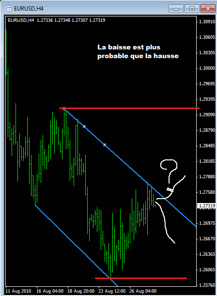 La résistance se situe sur la bordure supérieure du canal descendant en cours. Tant que celle-ci tient, on peut espérer une descente des cours et la cible se trouverait dans cette hypothèse vers 1.2500.