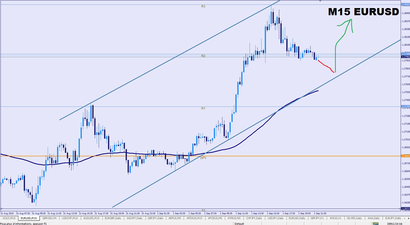 Pour ma part sur EUR/USD, d'après une étude en M15, je verrais bien un rebond vers la trend line avant une troisième phase d'accélération dans la tendance suite à la correction de ce soir.
