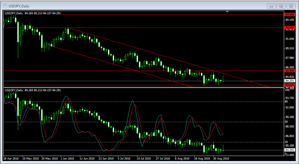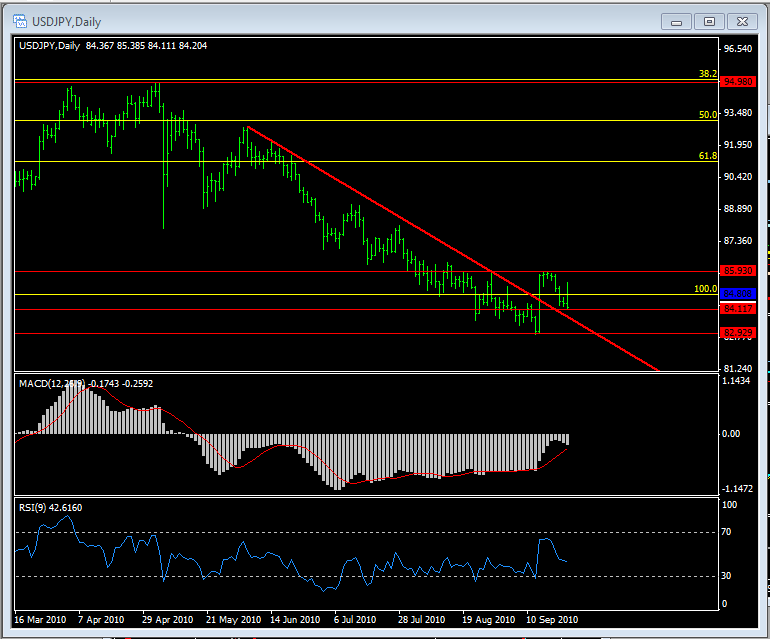 L’usdjpy est en train de former un plus bas à 83.62 en journalier. La paire est en range trading entre 83.62 et 85.90. Tant que la résistance 85.90 tient, la baisse commencée à 92.88 se poursuit pour aller vers 80.00 (zone) à la condition de casser le support 83.62.