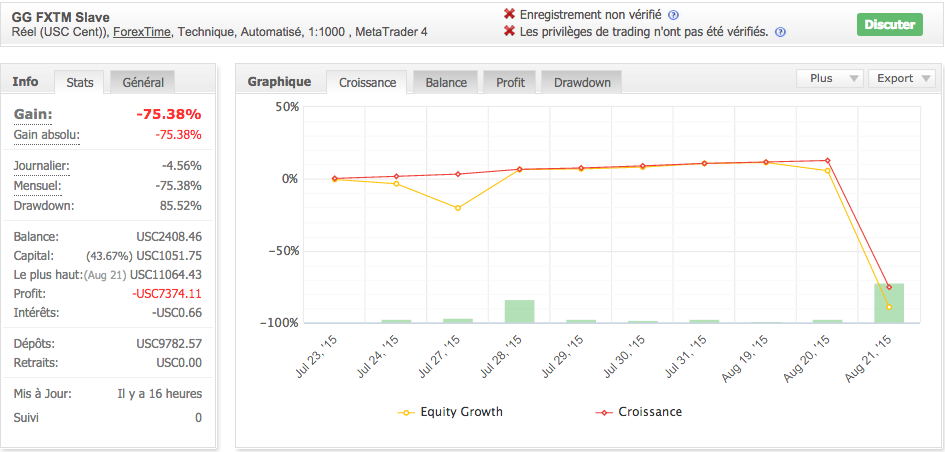 Le bug, ce fut la prise de lots trop important sur la paire GPBCHF. Et là je porte une lourde responsabilité. En effet, fin juillet j'avais tout arrêté pour solutionner ce problème. J'ai pas trop eu le temps de m'en occuper, le fait que les comptes étaient à l'arrêt me chagrinait, et j'ai tout remis en route en l'état.