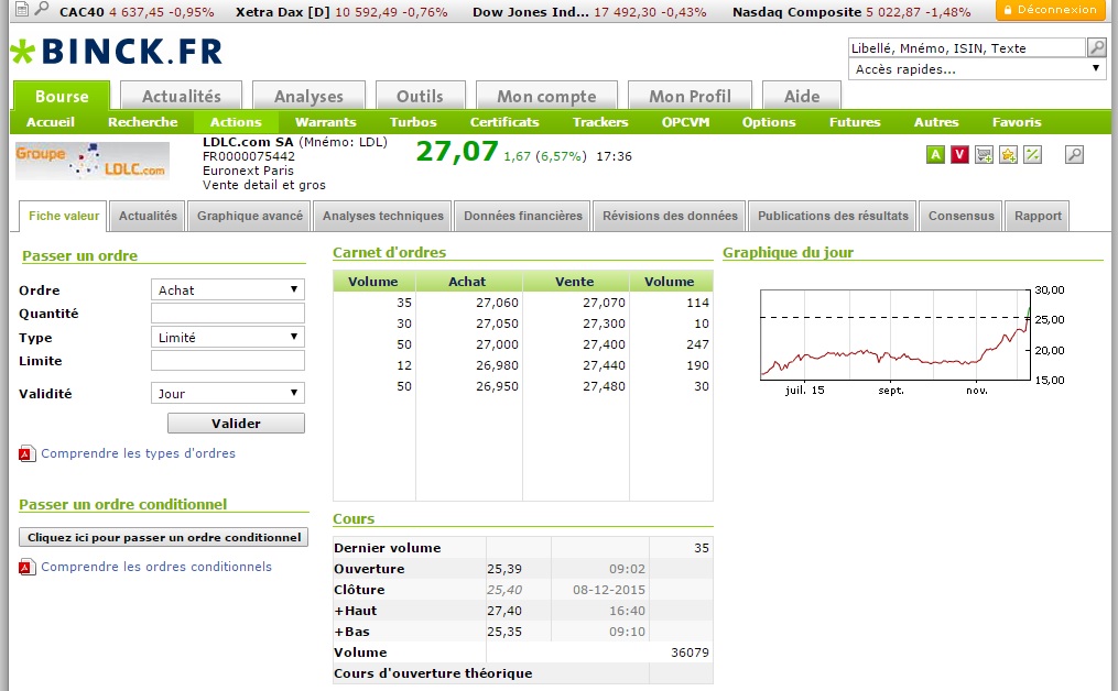 J'ai acheté pour 500€ du titre LDLC.com ce jour: belle hausse de plus de 6%, volumes étoffés sans être excessifs, intérêt en fin de séance.