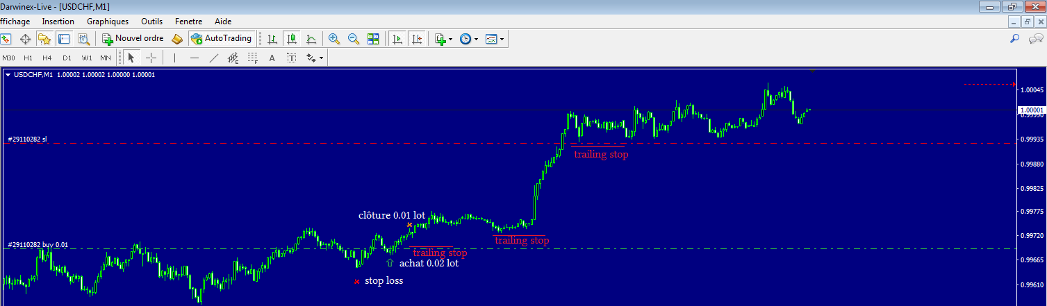 Je suis rentré sur un retracement en m1, j'ai clôturé 50% des profits au niveau de la résistance et le reste je le gère en trailing stop.