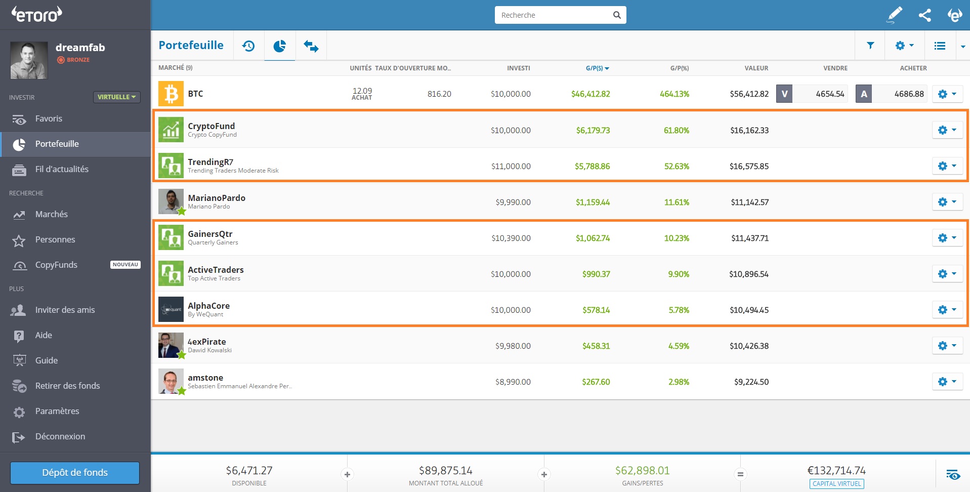 Voici, encadré en orange, les performances des différents CopyFunds choisis:
