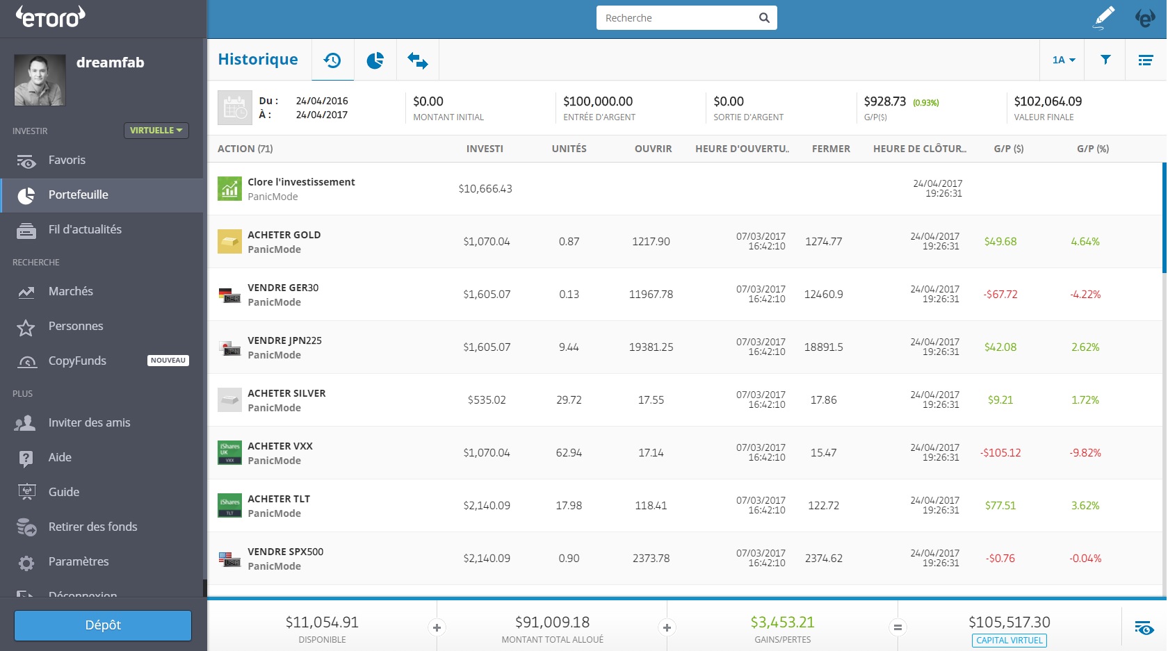 Parallèlement je vais un autre test sur les 20 traders les plus copiés sur la plate forme eToro. Sur les CopyTraders on peut ajouter/retirer des fonds. Je n'ai pas copié les positions ouvertes par les traders. Du coup j'ai peu de choses en portefeuille. Ouvrir les positions ouvertes, des fois depuis plusieurs mois plombe souvent les Gains/Profits. Je vais ouvrir un autre fil sur le forum pour cette expérience.