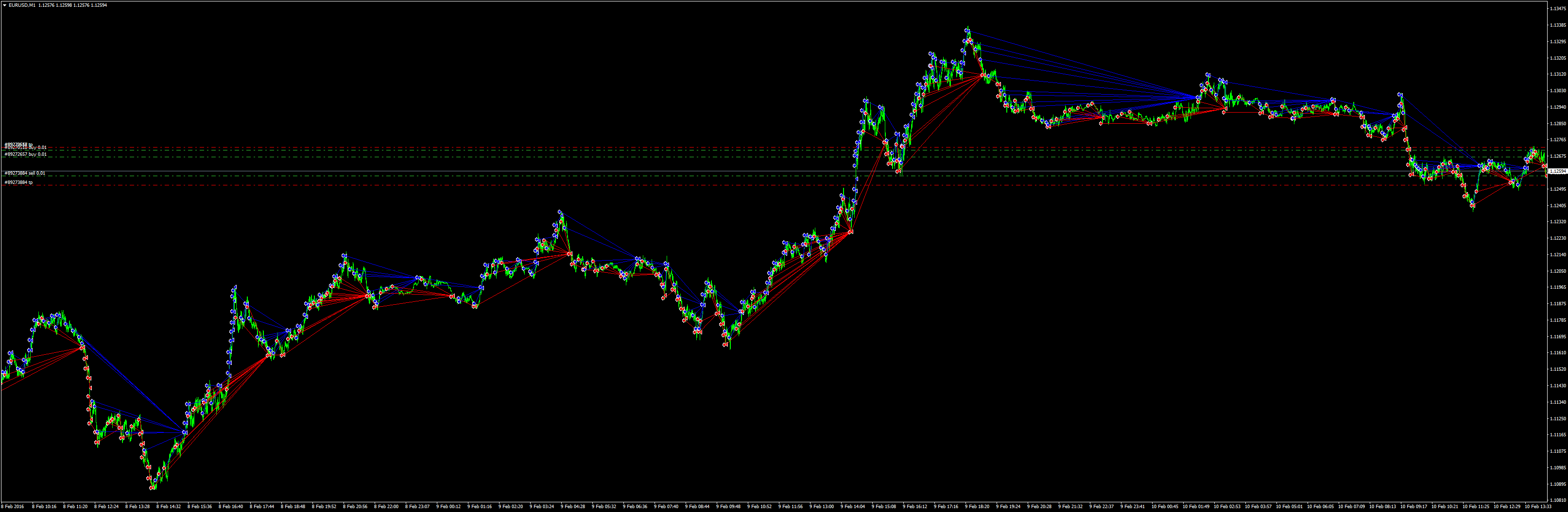 Concrètement, cela consiste à scalper en M1, non seulement pour capter de l'alpha dans le bruit du marché, mais surtout pour rester le plus possible 'collé' au cours de la paire, pour éviter de se faire déchirer sur contre-tendance lourde.
