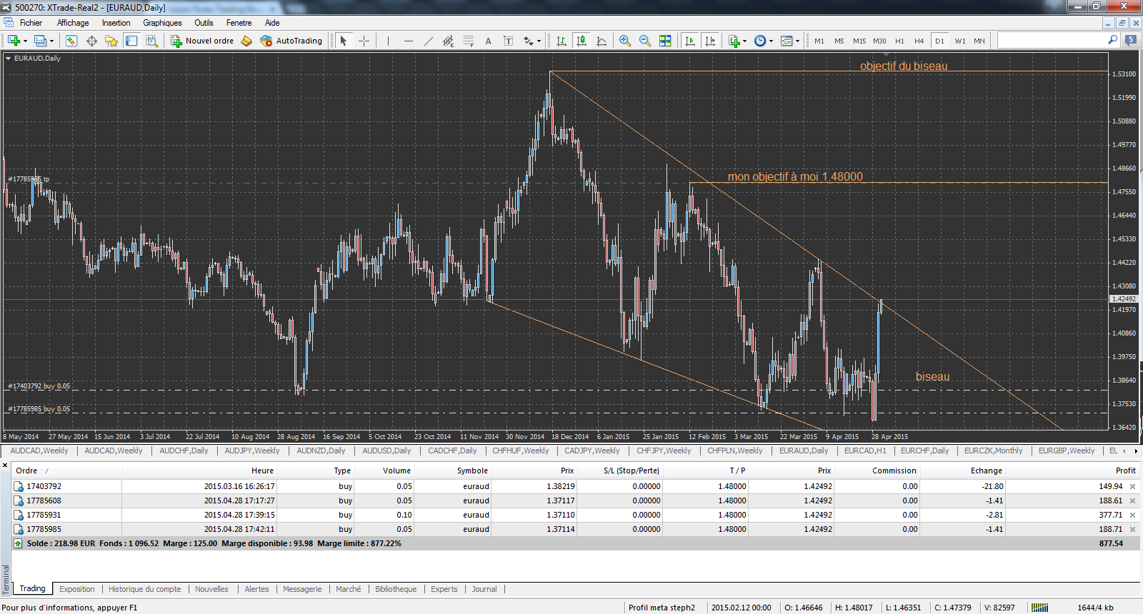 je préfère les configuration plus net. je suis toujour en position sur le biseau de l'euraud et je doit laisser agir l'audusd sur le stop ou sur l'objectif lol je prefère l'objectif bisarement lol
