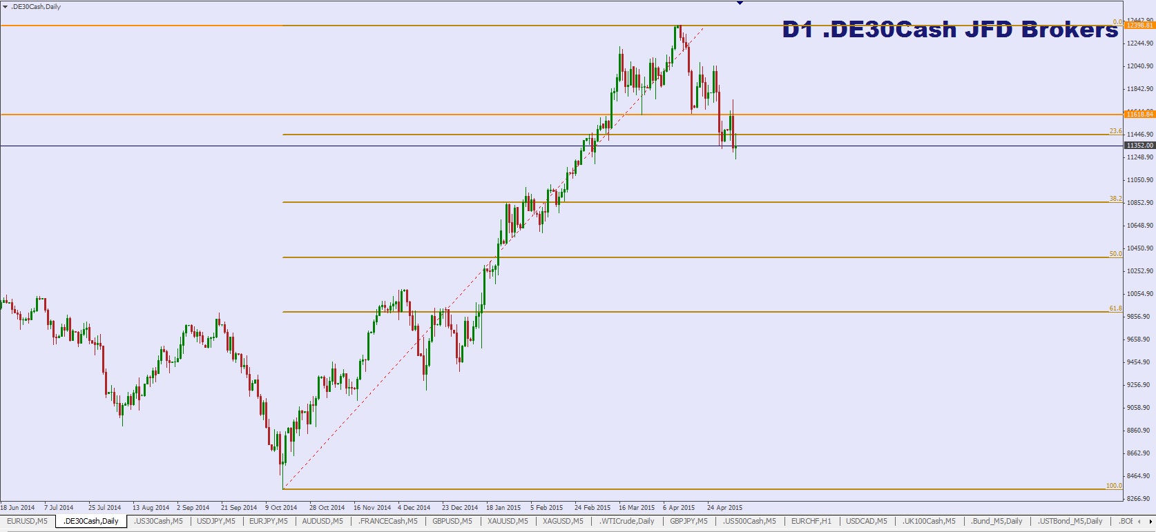 Après, histoire de dire quelque chose, vu qu'on a atteint et franchie les 23,6% de retracement du mouvement de hausse qu'on a eu de novembre 2014 à mars 2015, peut-être pourrions nous avoir une poursuite vers les 38.2% soit 10 854 points. De plus dans cette zone (10 563 / 10 991) on avait ralentit et stagné quelques semaines, donc c'est à priori une zone qui attire les échanges.