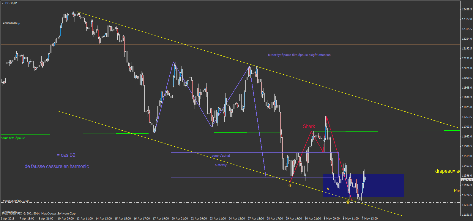 Attention au DAX je suspect une fausse cassure de l'épaule tête épaule à cause d'une butterfly (cas B2)et du drapeau jaune formé.