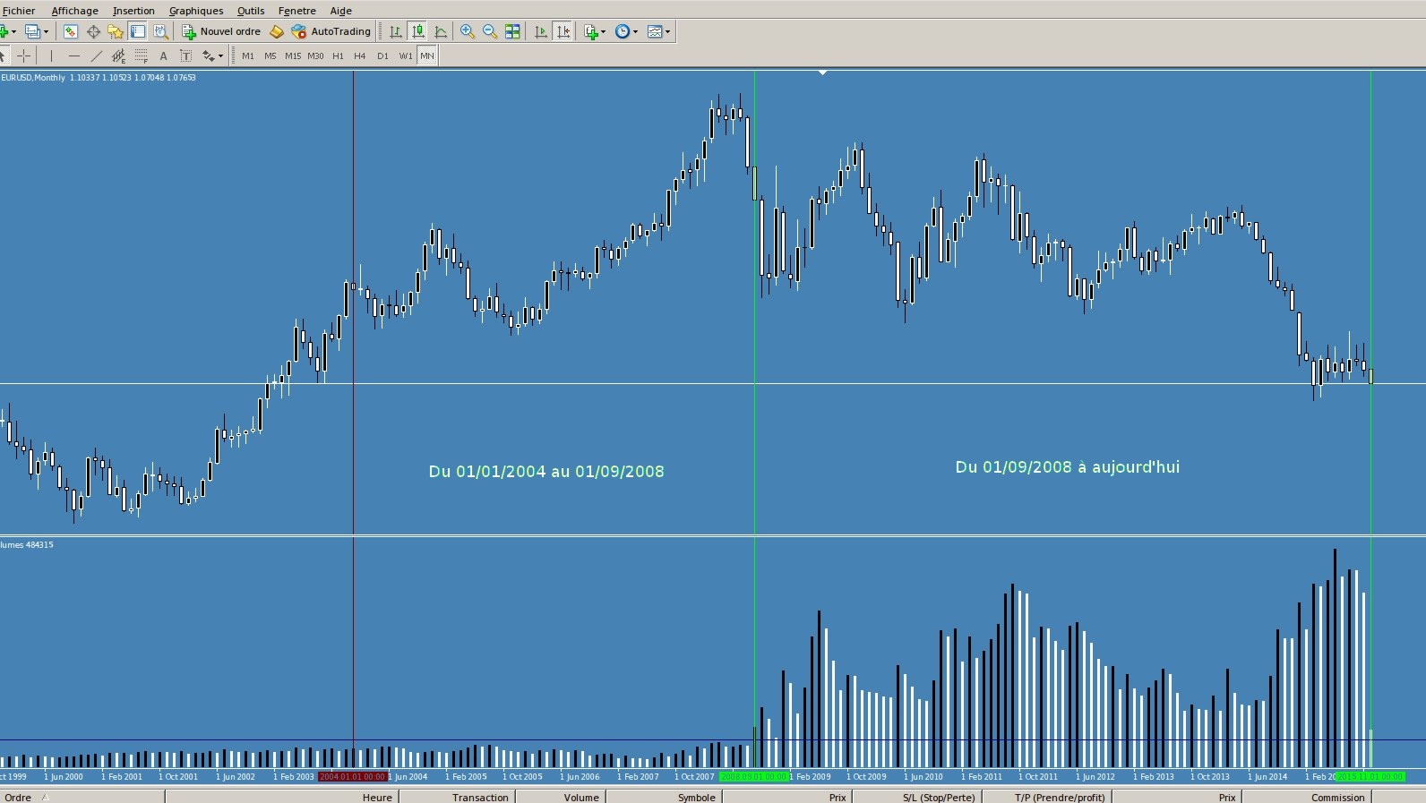 Observer bien le volume des deux périodes. A gauche la période jamais mise en avant en backtest et à droite la période tout le temps backtester…Oh misère ! Une recherche plus approfondie du code été nécessaire c'est certain.