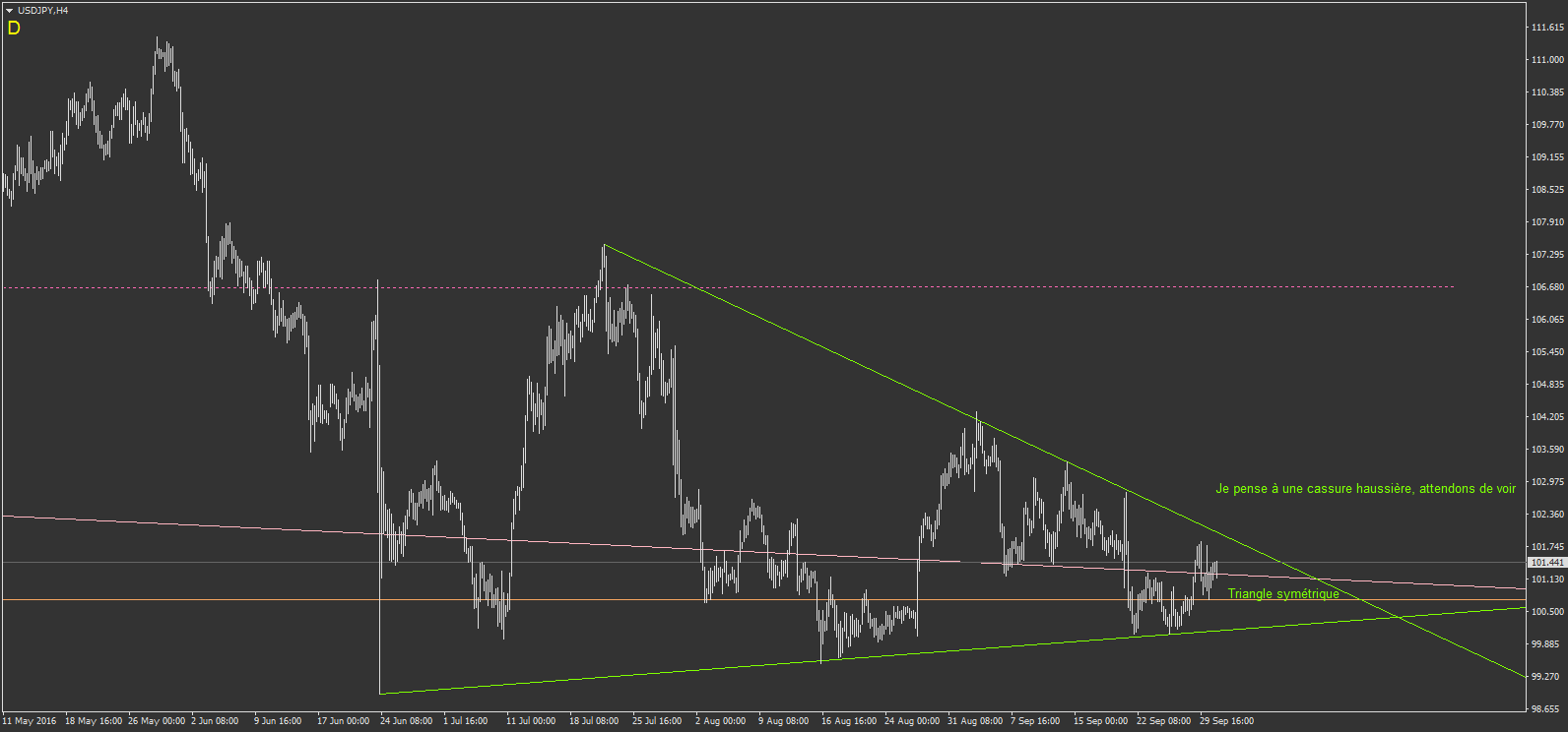 usdjpy, triangle symétrique où on arrive à la fin du triangle. bon moment pour une cassure cette semaine