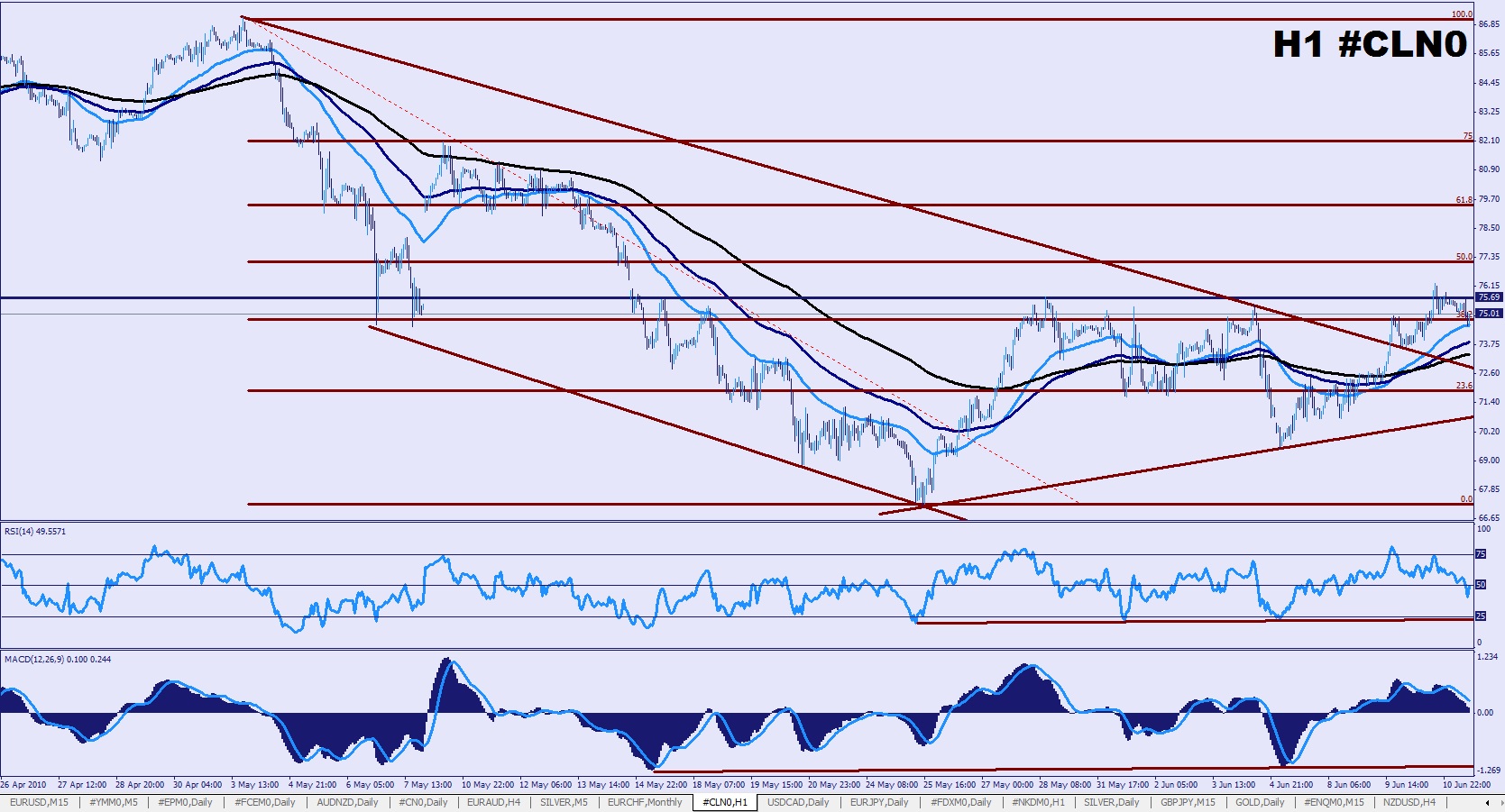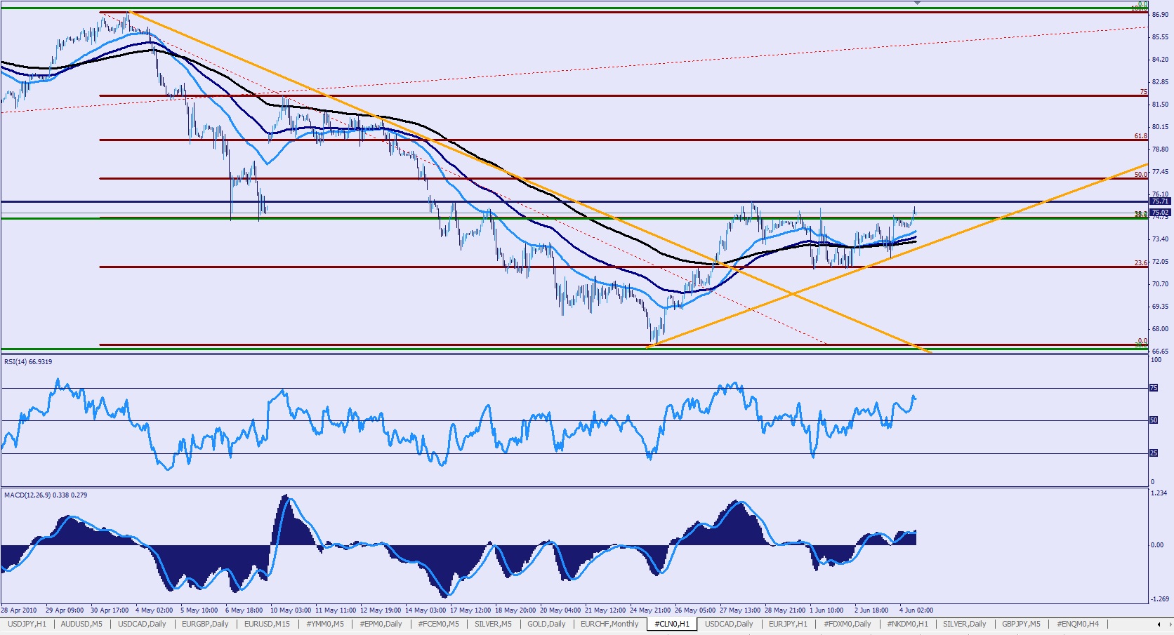 Techniquement on est dans une journée difficile il y a plusieurs résistance la veille trenligne haussier qui a avorter et la résistance 75.50 qui c est crée en aout 2009 et qui fonctionne des que on se trouve dessue ou dessous . Sur le rsi on arrive sur le 50 donc pour moi il vas falloir que les acheteurs se crache dans les main pour faire exploser . Perso je pense que mon trad long et a l abrie du ajourner pas très claire .