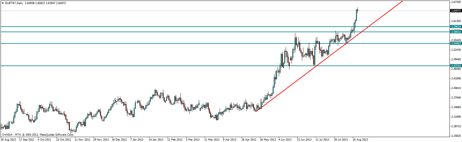 Personnellement, je trouve qu'il y a une marge de manœuvre pour une nouvelle hausse des taux de l'ordre de 75-100 bps la semaine prochaine. Je ne connais pas encore le consensus des prévisions, mais je serais étonné de voir un maintien des taux mardi prochain. Fondamentalement donc, les perspectives de l'EURTRY seraient baissières sous 2,58/59 si la BCRT monte ses taux encore mardi. Avec les perspectives baissières sur les taux de la Banque centrale européenne justifiées par les derniers discours de Mario Draghi, nous avons peut-être une nouvelle opportunité de vente de long terme qui se présente sur l'EURTRY.