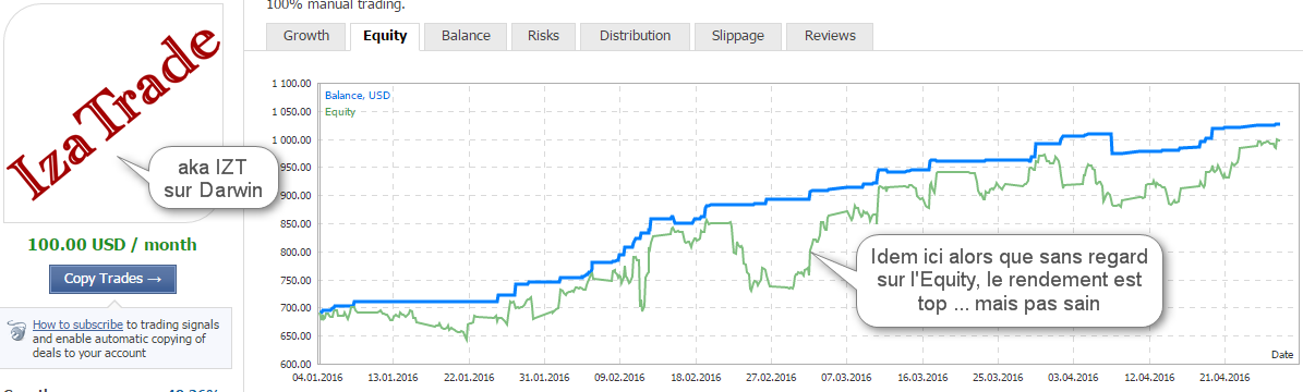 C'est toute la force de Darwinex ! Au lieu de payer $ 100.-- juste pour son signal et d'exposer un compte de $ 1'000.-- au minimum, j'investi seulement $ 200.-- sur le Darwin, et si après 3 mois j'ai vraiment gagné de l'argent, je lui paie 20% sur le gain.