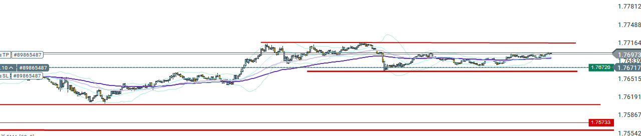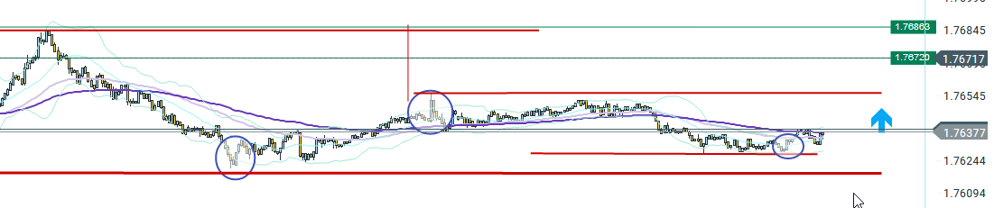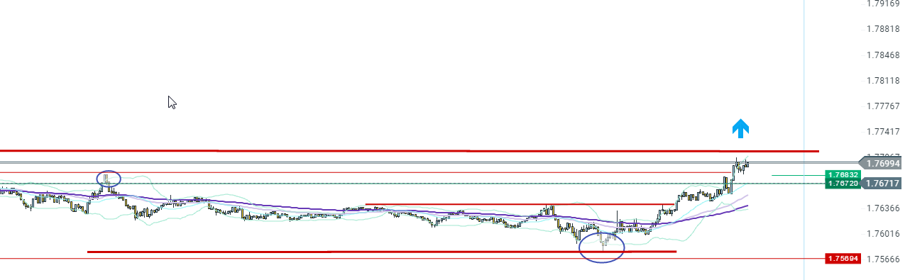 je suis donc descendu sur une UT M1 pour voir un peu l'orientation du cours, je vais considéré le niveau ... comme support sur cet UT, 1.76828, j'ai décidé de remonter mon stop loss au dessus de ma position étant donné que j'ai un volume 0.10 (qui est assez fort pour mon capital)