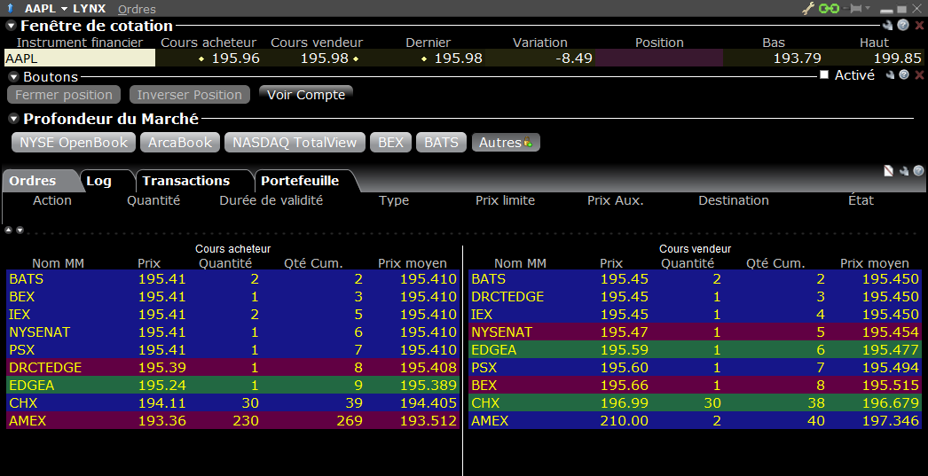 Comme discuté avec Phil sur le tchat, voici à quoi ressemble le carnet d'ordres pour l'action Apple sur le plateforme de LYNX / IB :