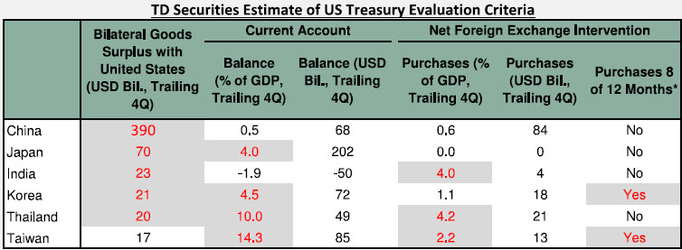 On constatera que ni la Chine, ni le Japon, ni l'Inde, ne pourraient (techniquement parlant) être taxés de pays manipulateur.