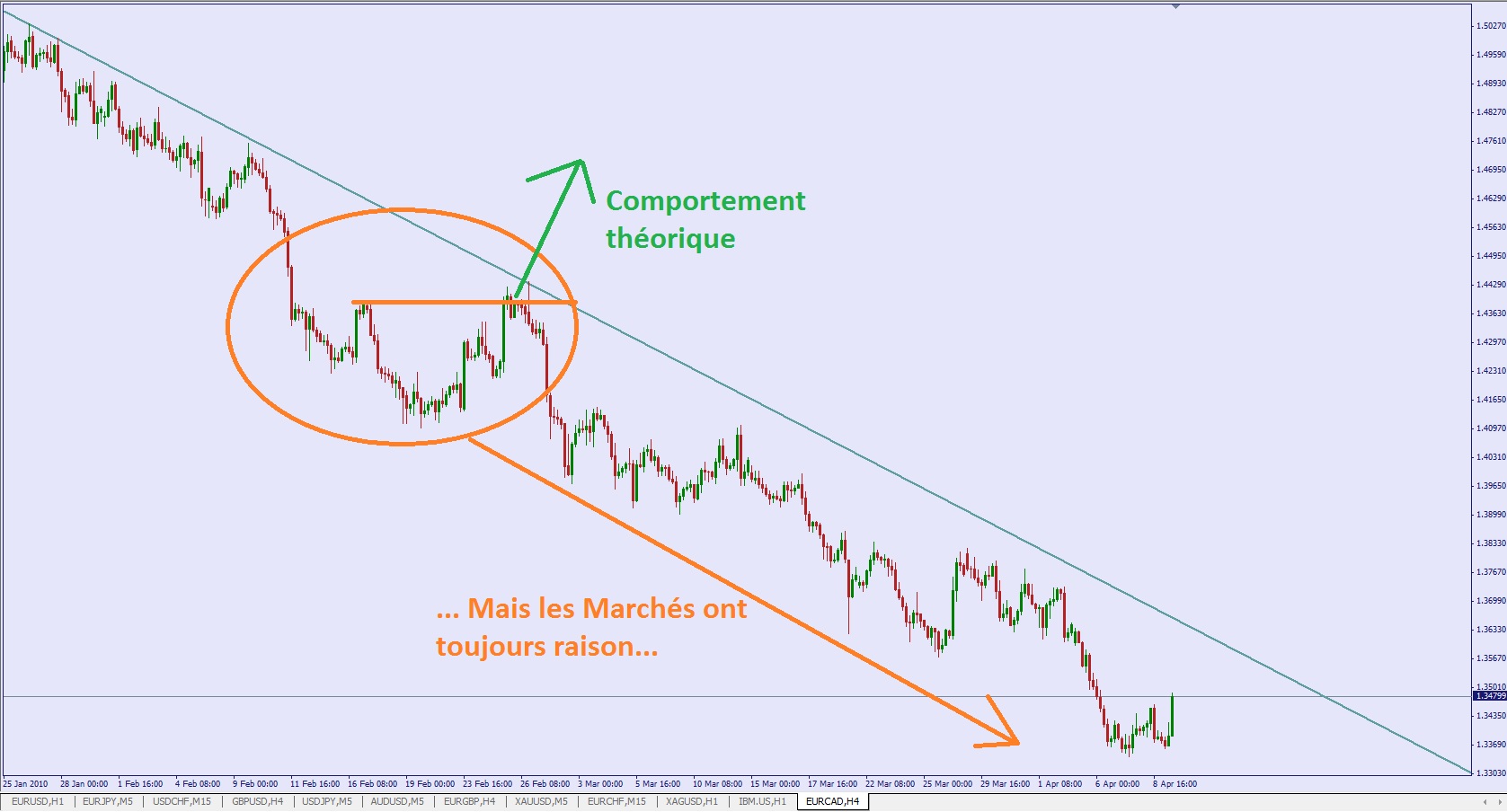 Figure de retournement majeure + trend line testée une quatrième fois (alors qu'en général, dans une tendance, on dit qu'une trend line est testée 3 fois avant d'être cassée) = ... Poursuite du mouvement et rebond sur la trend line...