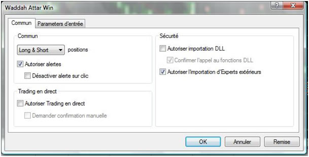Cochez la case Autorisez Trading en direct , puis allez dans le second onglet « Paramètres d’entrée ». Cette fenêtre va alors s’afficher