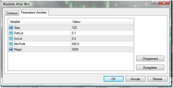 Dans ce dossier doit se trouver l’expert que vous venez d’installer. Cliquez alors sur le petit symbole + sur sa gauche pour faire apparaître les différents experts advisors installés sur votre plate forme. Une fois sélectionné, faites le glisser vers le graphique des cours. Une fenêtre comme celle-ci s’ouvre alors :