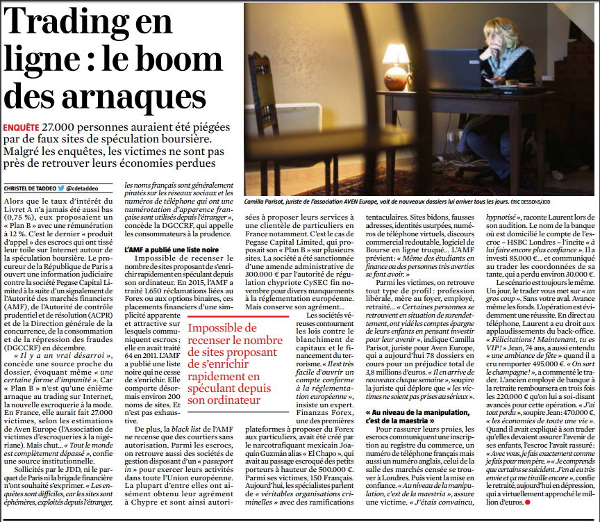C'est le Parisien qui cette fois ci fait sa une avec les arnaques liées au trading , et avec un reportage de 2 pages, où l'on apprend que le total des arnaques connues (il y a tellement de personnes qui n'osent dire qu'elles se sont faites arnaquer!!! :( ) dépasse déjà 4,5 Milliards d'euros rien qu'...