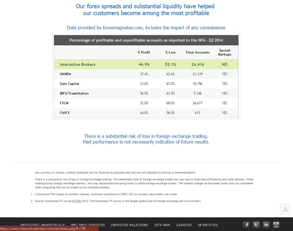 Sur le site d'Interactive Brokers on peut voir ce tableau présentant le pourcentage de traders gagnants et perdants chez les différents gros brokers FOREX Américains fournit par le site ForexMagnates:Voici également une pub d'Interactive Brokers publiée récemment (en Anglais):