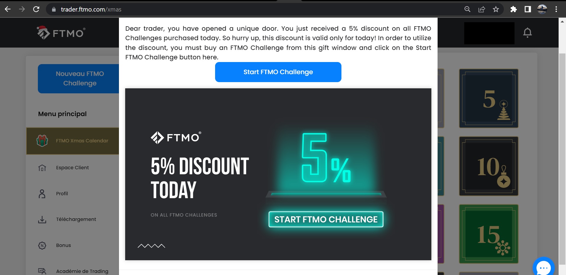 Le cadeau du jour est un discount de -5% sur tous les Challenges FTMO, valable seulement aujourd'hui :