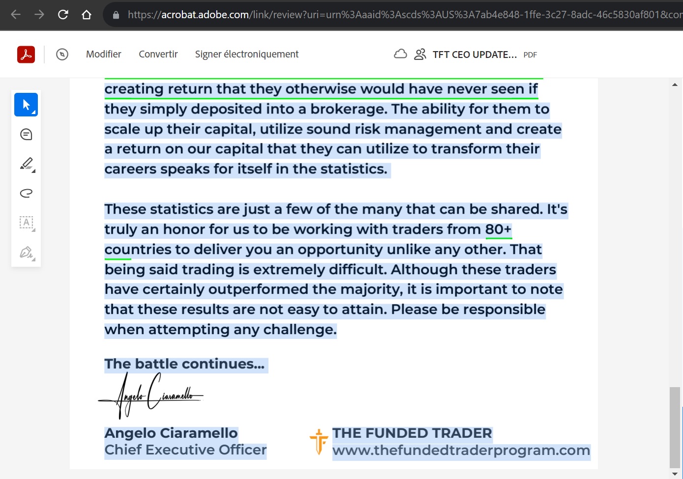 Pour ceux qui ne parle pas anglais, je vous mets ici la traduction en français du mot de la fin du PDG de "The Funded Trader" :